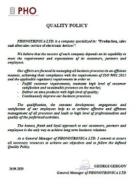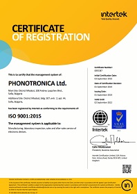 PHONOTRONICA Ltd. was established in 1990 with the object of developing, manufacturing and marketing of electronic products. Developed, manufactured and implemented in units of BTC in the country are four products are successfully operated more than 20 years. The first Bulgarian electronic tariff clocks and electricity meters are our idea, development, production and deployment in the divisions of distribution companies. The company has a certificate of quality management ISO9001: 2015 under № QMS / 92387 / BG issued by the Intertek Certification Limited on 19.07.2022 year.